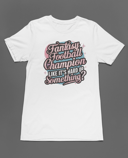 Featuring the sassy phrase 'Fantasy Football Champion: What? Like It's Hard or Something?' in bold lettering, this shirt is a playful nod to your fantasy football triumphs. Whether you're flaunting your championship belt or challenging your league mates to keep up, this shirt is the perfect way to showcase your confidence and style.